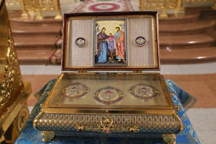 По благословению Святейшего Патриарха Московского и всея Руси Кирилла ковчег с частью Пояса Божией Матери и частицами мощей святых праведных Ее родителей Иоакима и Анны принесен из Казанского кафедрального собора Санкт-Петербурга.